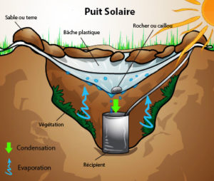 - une technique assez connue par les survivalistes consiste à créer un puit solaire en tendant une bâche transparent au dessus d’un trou, des branches fraîchement coupées exposées au soleil sous la bâche et une pierre placée au milieu de la bâche pour faire couler l’eau qui se condense dans un récipient. Les mieux équipés auront un tuyau qui remonte du récipient jusqu’à la surface pour boire l’eau sans tout démonter. Nous avons un schéma pour bien illustrer le montage. Vous l’aurez compris : la chaleur des rayons du soleil va faire évaporer l’eau des feuillages et la bâche empêche l’eau de s’en aller, la fait condenser et retomber dans le récipient sous forme liquide.